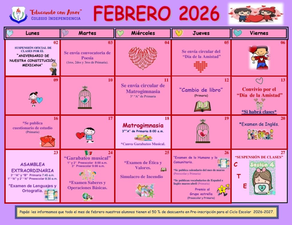 Calendario Febrero 2026 February 5, 2026 February 5, 2026 Les compartimos las actividades mas relevantes de este mes. Calendario Enero 2026